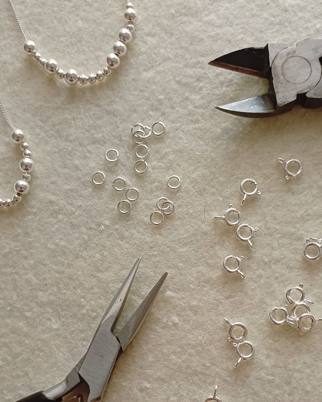 Viesti-koruissa lyhyet ja pitkät signaalit ovat pieniä ja suuria hopeahelmiä.